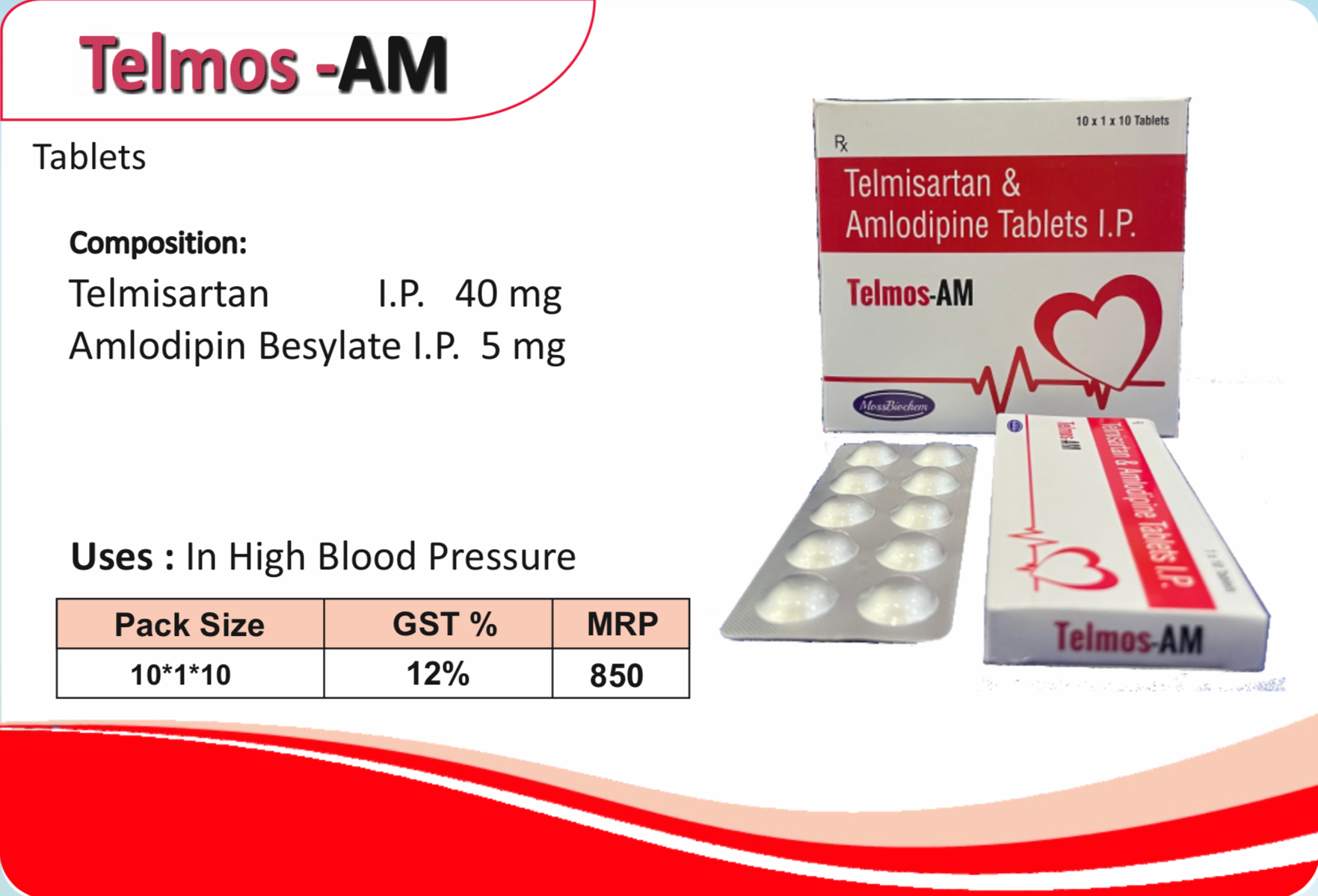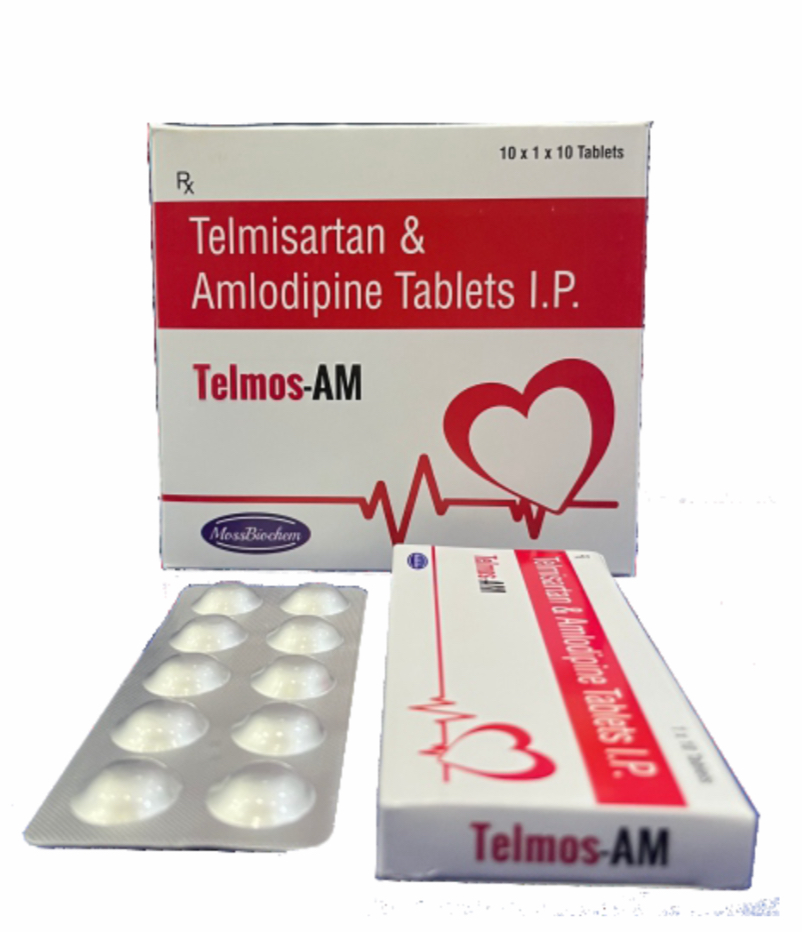 TELMOS-AM Tablets combine Telmisartan (an angiotensin II receptor blocker) with Amlodipine (a calcium channel blocker) in a once-daily dosage. This synergistic duo effectively lowers blood pressure, reduces afterload, and offers cardioprotective benefits for hypertensive patients.